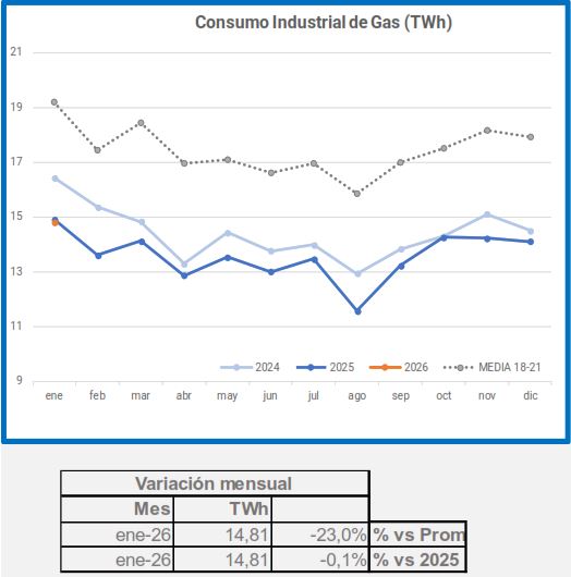 La industria consumió en enero un -0,1% de gas, en comparación con el mismo período de 2025, descendiendo hasta el 23% si lo comparamos con el promedio 2018-2021. Si analizamos la demanda de gas industrial en los diez sectores con...