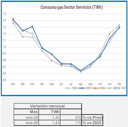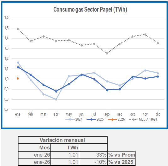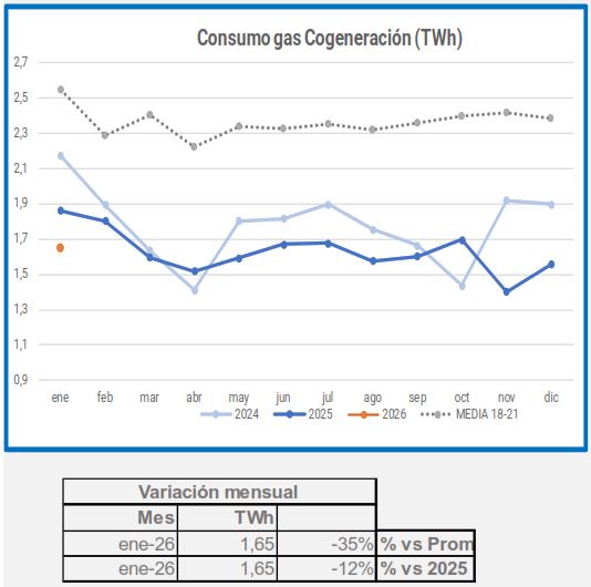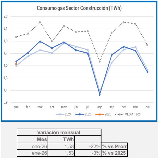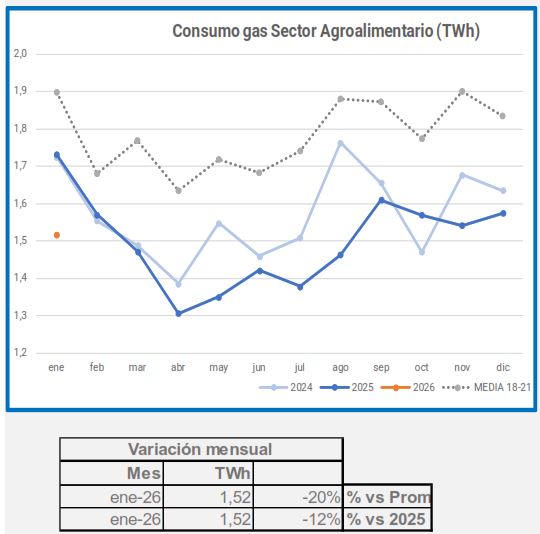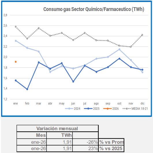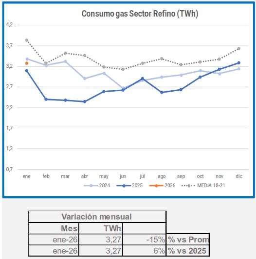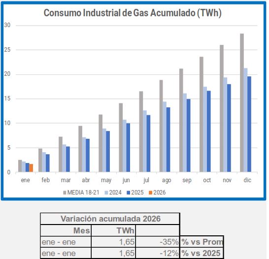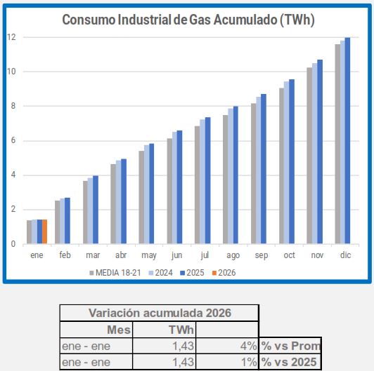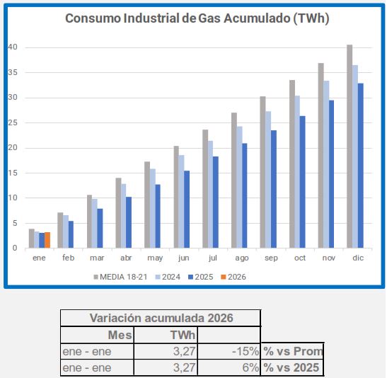 La industria consumió en enero un -0,1% de gas, en comparación con el mismo período de 2025, descendiendo hasta el 23% si lo comparamos con el promedio 2018-2021.
