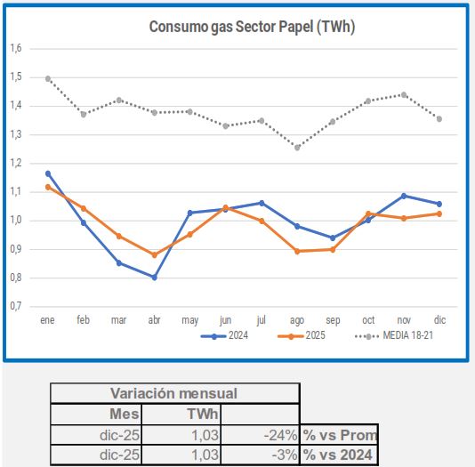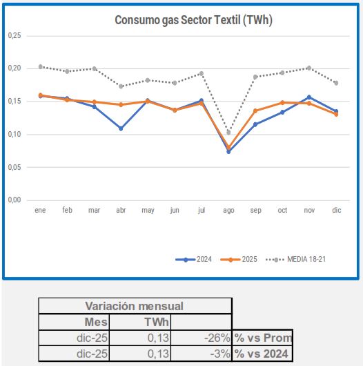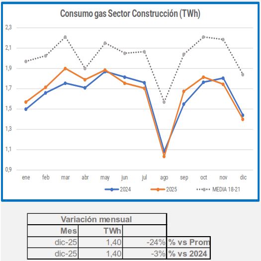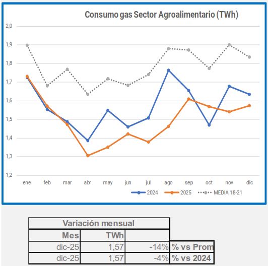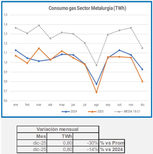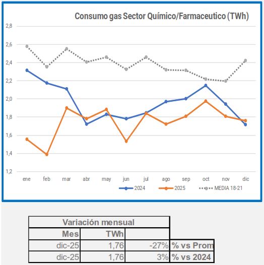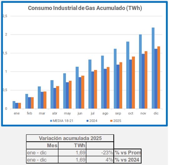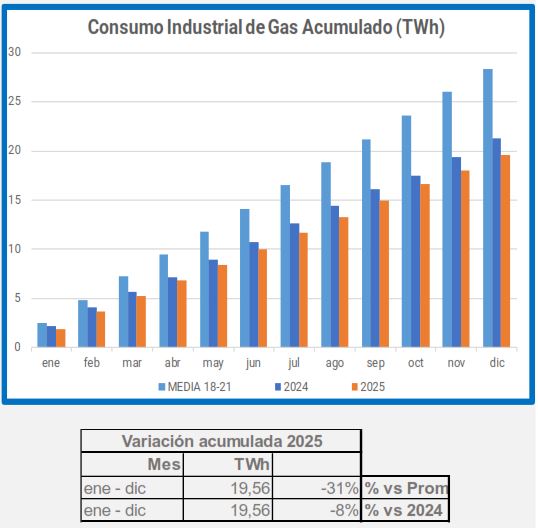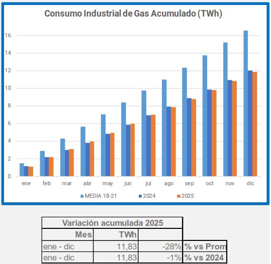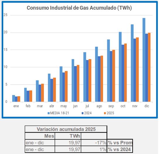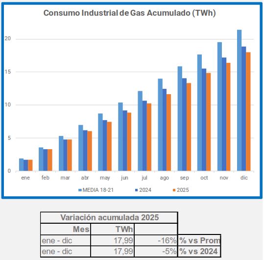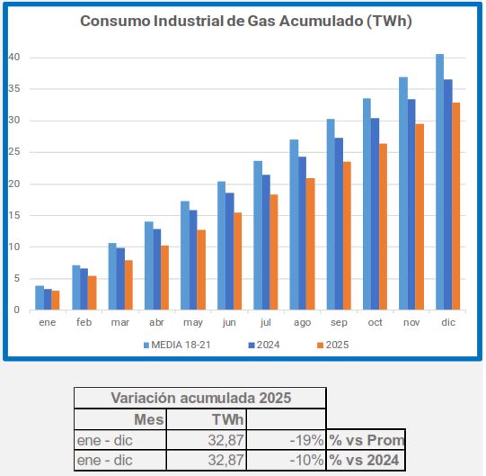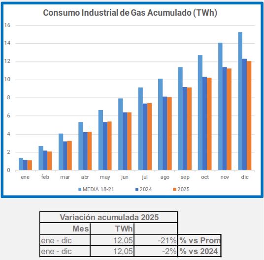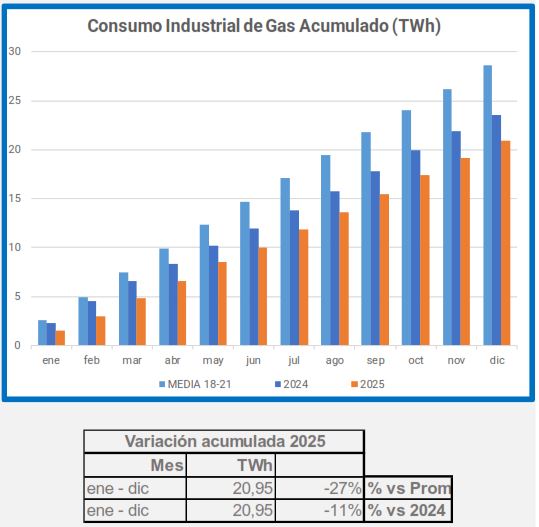 En diciembre, la demanda de gas industrial disminuyó un 2,2% en comparación con el mismo período de 2024, y un 21% en comparación con el promedio de 2018-2021.