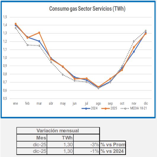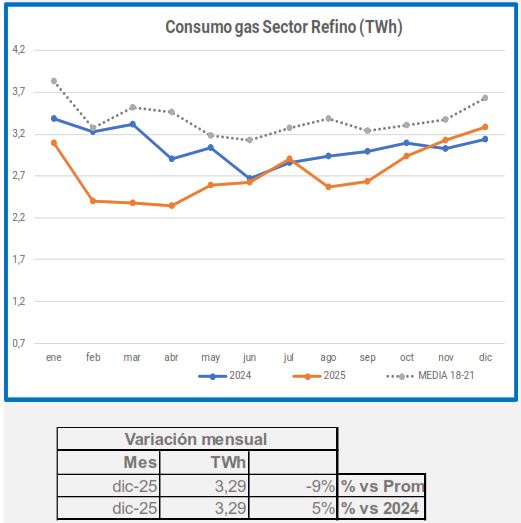 En el último mes de 2025 los sectores que han destacado con datos positivos han sido Refino y Químico/Farmaceútico, con un ligero incremento de la demanda de gas del 5% y el 3% respectivamente. En el otro lado, se sitúan Cogeneración, con un descenso del -18%, y Metalurgia con un -14%.
