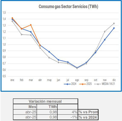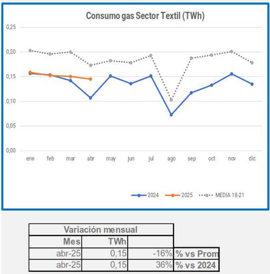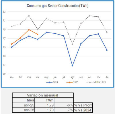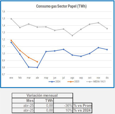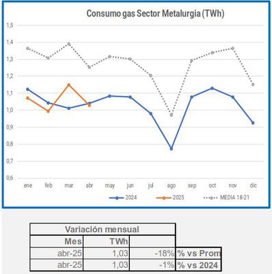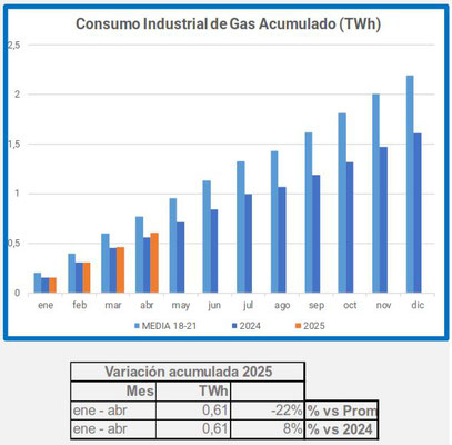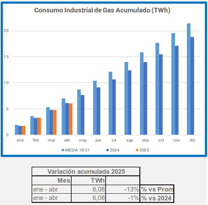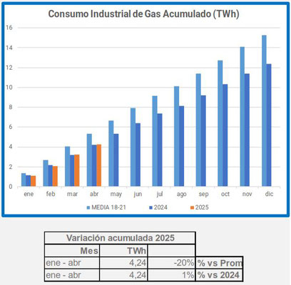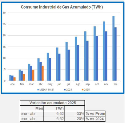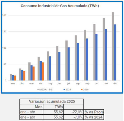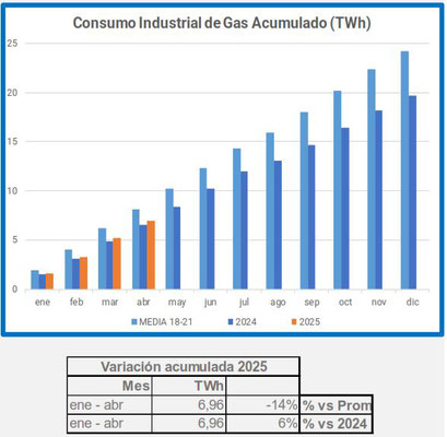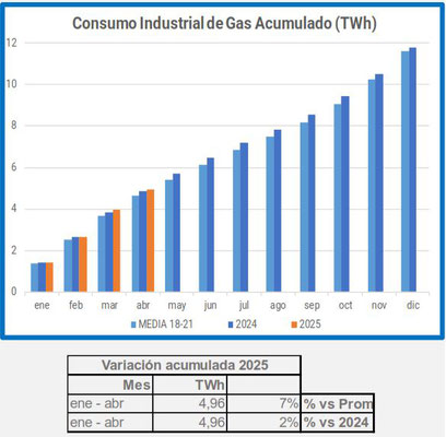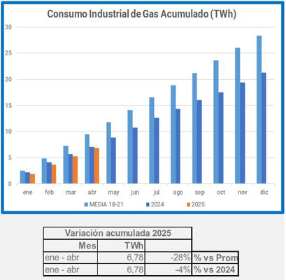 El consumo industrial acumulado del año, comparado con el 2024, es de -7%, y comparado con el promedio 2018/2021, desciende un 22,9%.