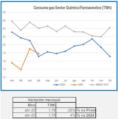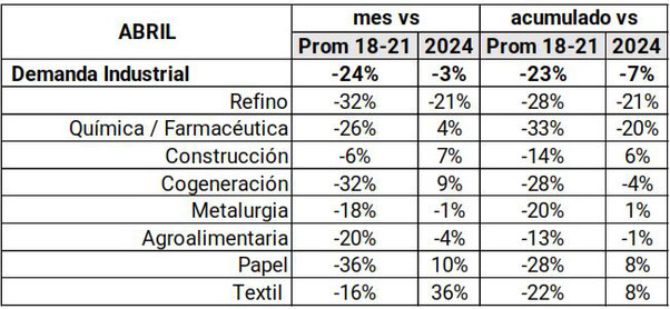 En abril, el consumo de gas industrial se situó en un -3%, y el descenso alcanzó el -24% si comparamos la demanda de gas con el promedio 2018/2021.