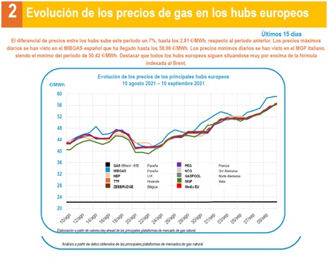 El último boletín de precios de mercados de GasINDUSTRIAL, correspondiente al periodo del 28 de agosto al 10 de septiembre de 2021, señala que sube un 21,4% la media de los precios spot de los hubs europeos hasta los 50,81€/MWh, 8,95 €/MWh más que el periodo anterior, rompiendo todos los récords conocidos hasta el momento.
