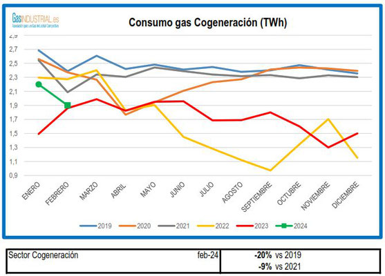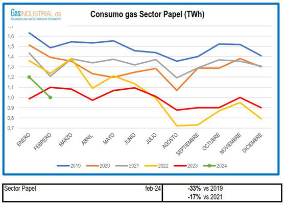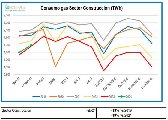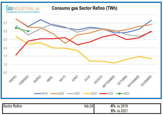A continuación, mostramos los gráficos correspondientes al mes de febrero de los principales sectores industriales consumidores de gas -químico, siderúrgico, papel, construcción, cogeneración y refino.