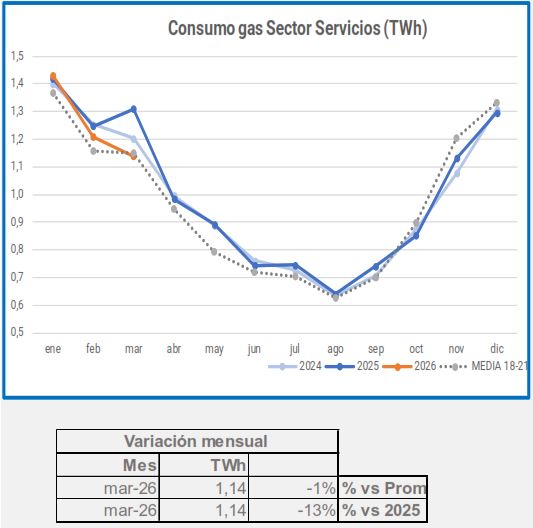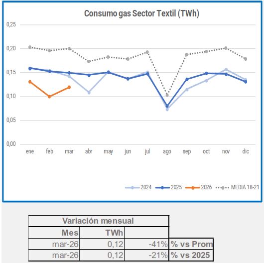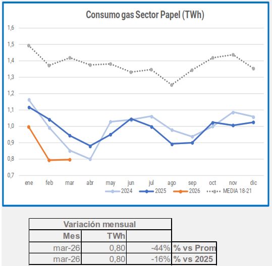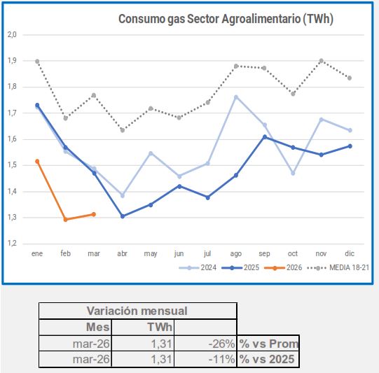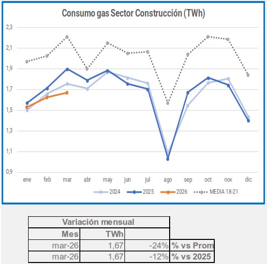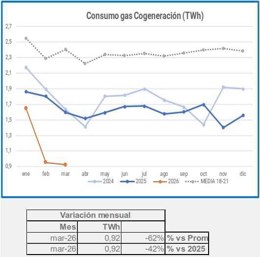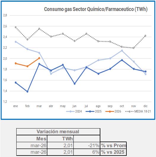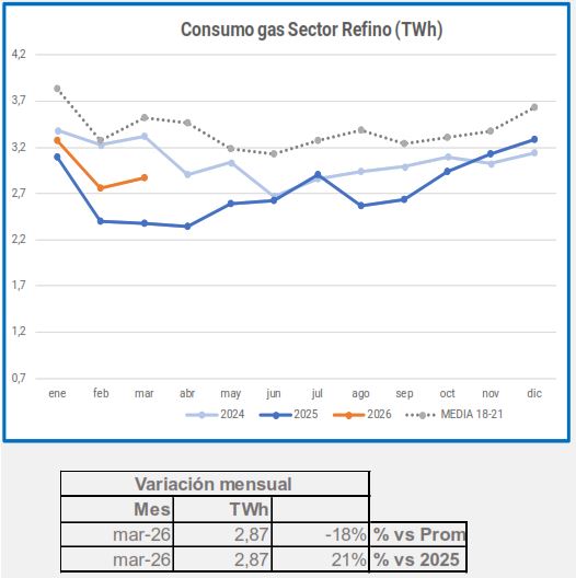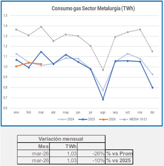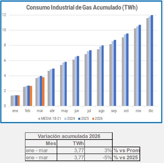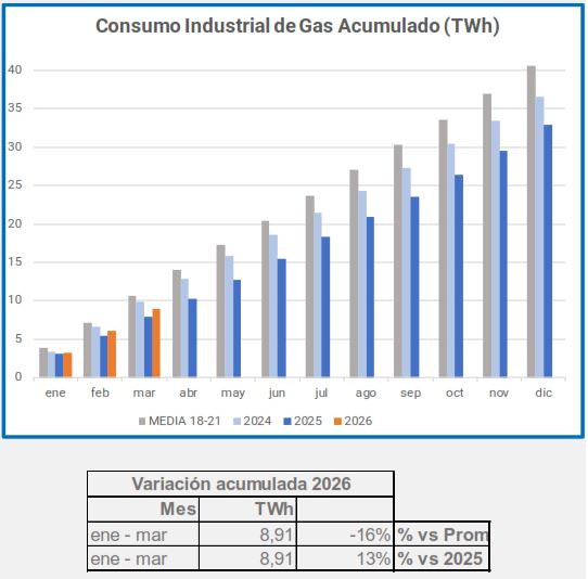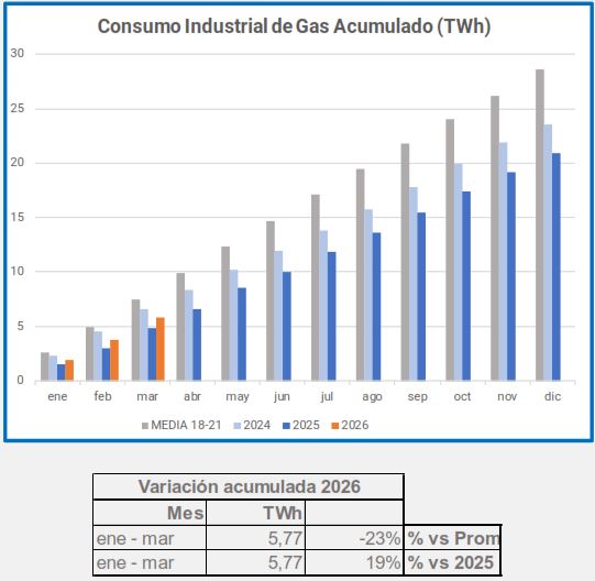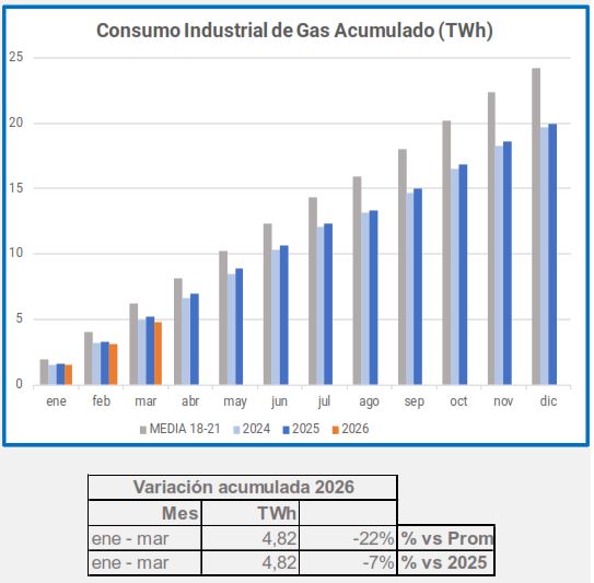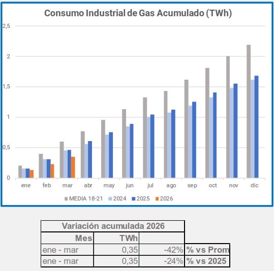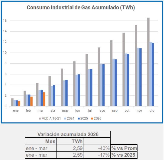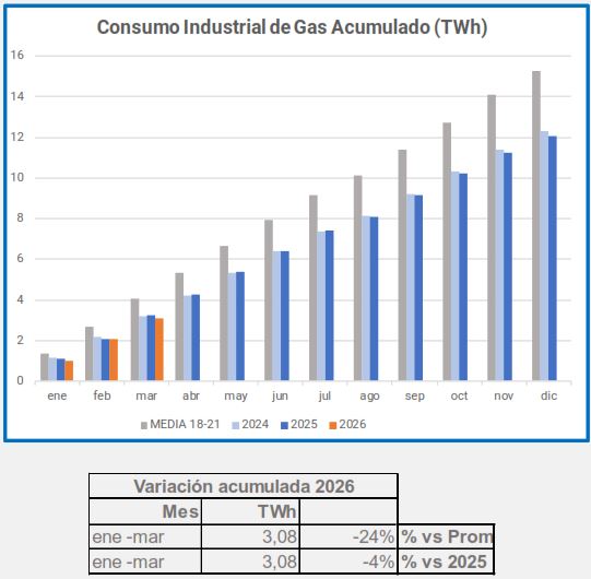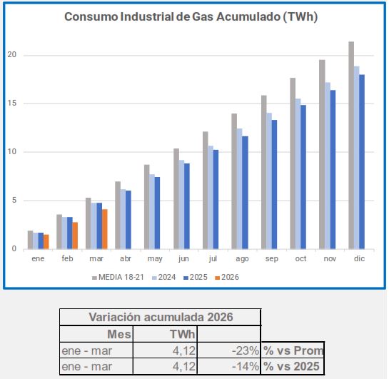 En marzo, el consumo industrial de gas descendió un -5,4%, en comparación con el mismo período de 2025, descenso que alcanza el -29% si lo comparamos con el promedio 2018-2021.